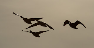 Bij de plas blijken de meeste beesten in de luwte aan de oostkant te zitten: heel verstandig. Ik kijk recht tegen de wind in en ben in een paar minuten als bevroren. In de verte herken ik een paar Blauwe en één Grote Zilverreiger, een groot aantal Smienten en Grauwe Ganzen en een paar Tafel- en Kuifeenden. Ik rijd een stukje door naar de rietkanten langs het spoor, maar de wind en het ijs hebben daar vrijwel alles verjaagd. Gelukkig gebeurt er in de lucht van alles. Tientallen Grauwe, Kol- en Rietganzen vliegen over mijn hoofd, maar de Kraanvogels blijven uit mijn zoeker. Het gedempte licht van het winterzonnetje zorgt wel voor een leuk sfeertje en tekent bijzondere kleuren in de lucht.